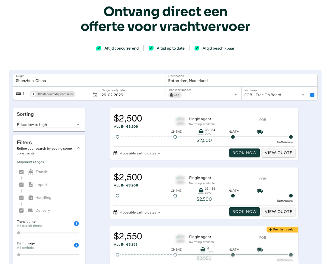 - Objectief vergelijken: Alle offertes worden in een gestandaardiseerd dashboard gepresenteerd. Met één klik vergelijkt je objectief op totaalkosten, transittijd en de betrouwbaarheid van de vervoerder.